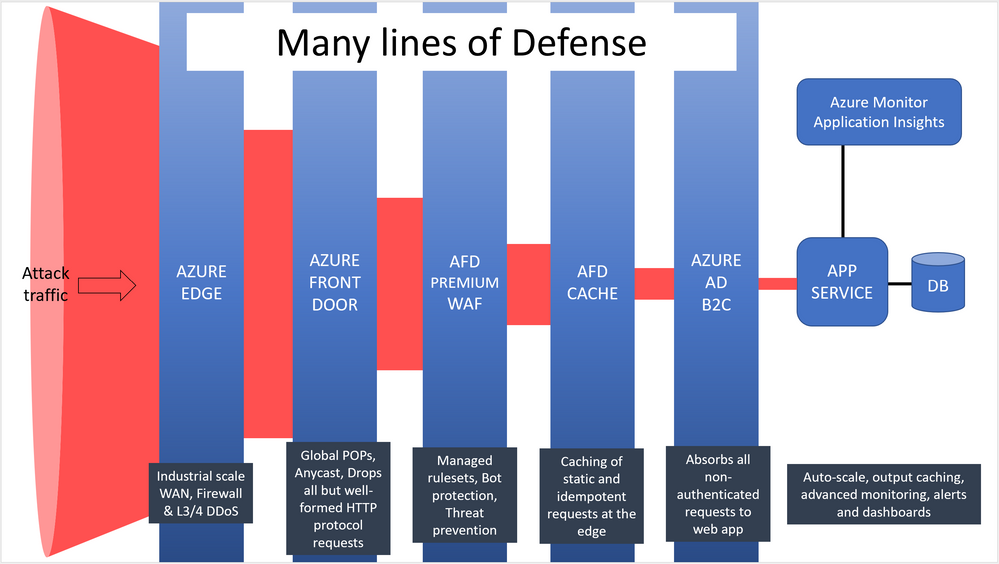 La buena noticia es que las plataformas de computación en nube como Microsoft Azure proporcionan servicios globales como Azure Front Door que ayudan a protegerse de los ataques DDoS, proporcionando varias capas de defensa para reducir el impacto de un ataque y disuadir a los atacantes.