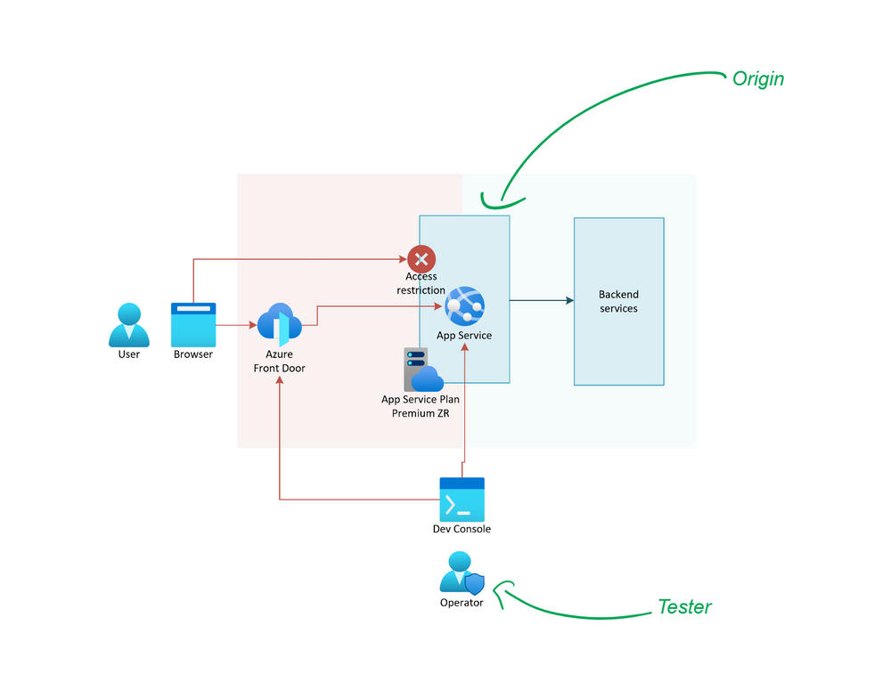 Las solicitudes a Front Door se enrutan a un grupo de origen mediante una regla de enrutamiento, con el almacenamiento en caché activado. El grupo de origen es un Azure App Service con restricciones de acceso para aceptar únicamente tráfico de Azure Front Door o la del ordenador del desarrollador.
