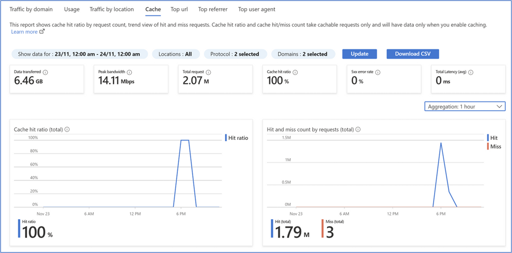 El rendimiento de la caché puede ser monitorizado en el Azure Portal usando los informes Azure Front Door, o escribiendo tus propias consultas Kusto en Front Door Logs (Azure Monitor).