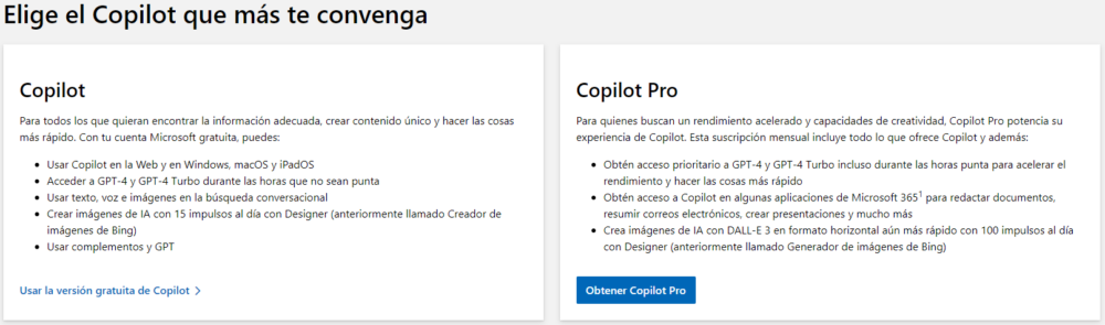 Copilot gratuito, Copilot Pro y Copilot para Microsoft 365