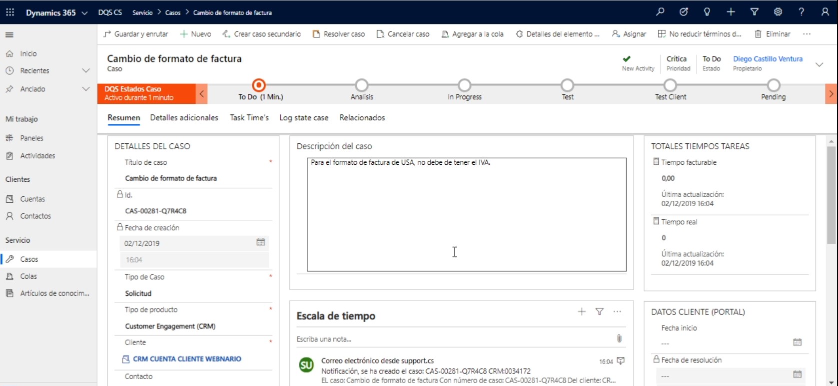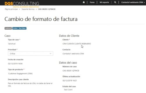 Entraremos en la fase Test cuando las tareas estén finalizadas. Asignaremos a un técnico y marcaremos el % del proceso para de esta manera informar al cliente que nos ha generado el caso que pasamos a la fase Test cliente. Automáticamente, en su portal podrá visualizar la pestaña Activo-Test Client.