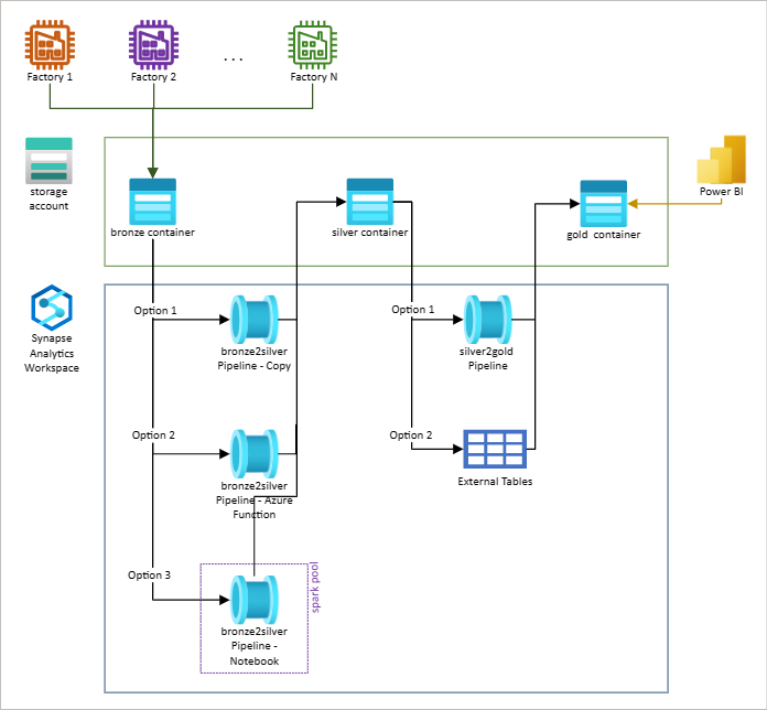 - Función Azure – Una función Azure leerá una tabla de control y se utilizará para mover los archivos no procesados en el contenedor bronce (bronze) al contenedor plata (silver) después de aplicar alguna lógica de negocio compleja.