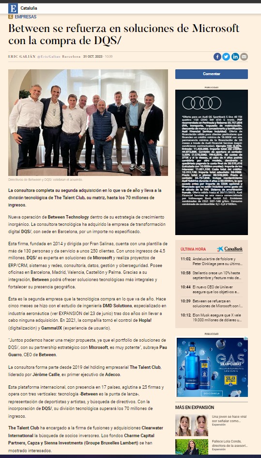 Between se refuerza en soluciones de Microsoft con DQS y llevando a la división tecnológica de The Talent Club, su matriz, hasta los 70 millones de ingresos.