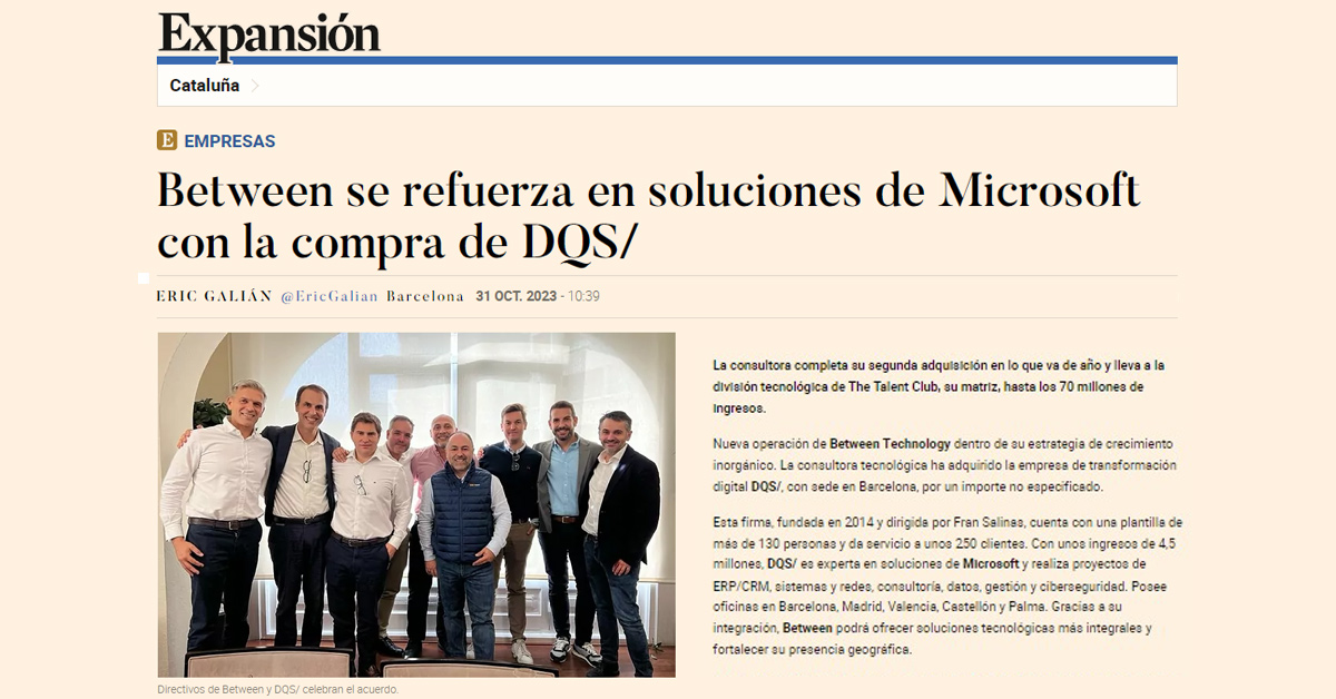 DQS fue fundada en 2014 y dirigida por Fran Salinas. cuenta con una plantilla de más de 130 personas y da servicio a unos 250 dientes. DQS/ es experta en soluciones de Microsoft y realiza proyectos de ERP/CRM. sistemas y redes. consultoria, datos, gestión y ciberseguridad. Posee oficinas en Barcelona. Madrid. Valencia. Castellón y Palma. Gracias a su integración. Between podrá ofrecer soluciones tecnológicas más integrales y fortalecer su presencia geográfica.