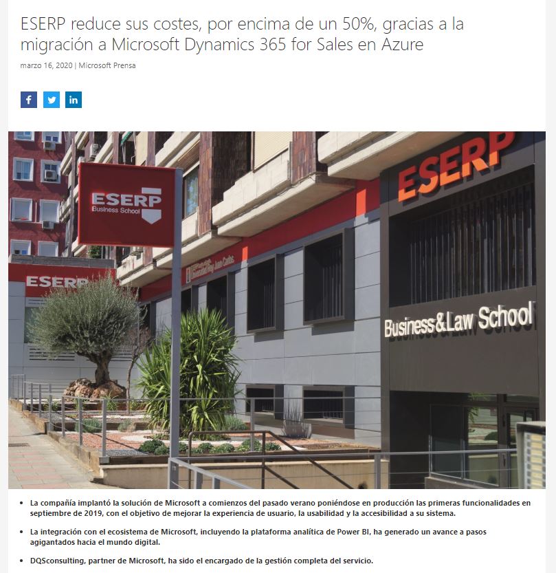Microsoft ha publicado en su Centro de noticias, con difusión a nivel mundial, nuestro último caso de éxito con la escuela de negocios ESERP Business & Law School.