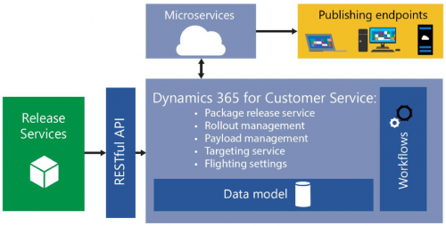 El motor de lanzamiento de servicios envía información de actualización a Dynamics 365 for Customer Service utilizando un conjunto de interfaces de programación de aplicaciones RESTful. Los datos y metadatos actualizados de la versión se transfieren a un almacén de Dynamics 365 y pueden manipularse utilizando la información de la versión del paquete, la gestión del despliegue, la gestión de la carga útil, la orientación y la confirmación de vuelo.