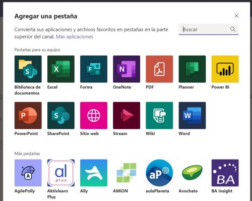 El proceso es muy sencillo, solo hay que pulsar el + dentro del canal y agregar una pestaña. Podrás realizar la búsqueda de la aplicación que necesites e insertarla en tu equipo.