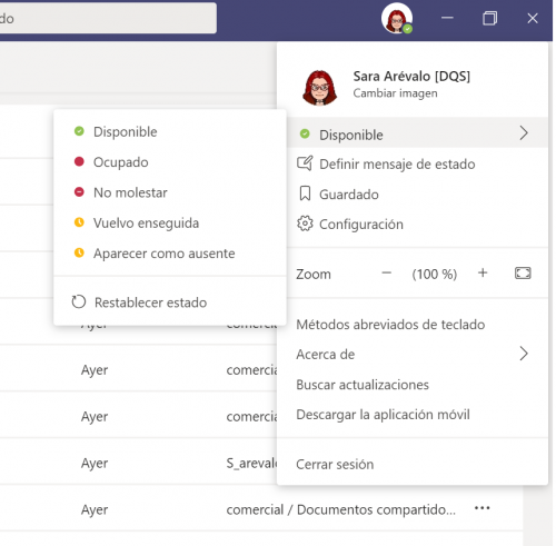 Para conocer la disponibilidad de los miembros de mi equipo Teams cuenta con diferentes estados, como podemos observar en el ejemplo. Tenemos la opción de marcar las opciones prestablecidas o definir nuestro mensaje de estado.