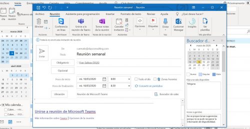 Desde Teams puedes organizar una conferencia múltiple enviando las convocatorias a través de Outlook. La gran ventaja de esta aplicación es que te permite enviar la cita, tanto a usuarios internos de tu empresa, como a externos.